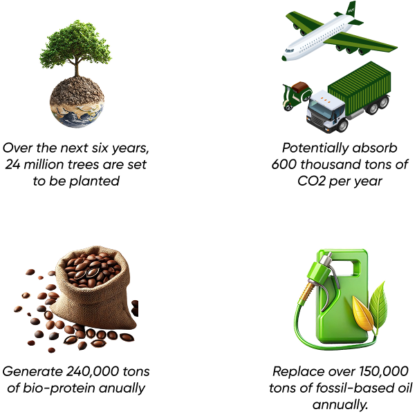 Carbon sequestration, protein and oil production through reforestation.